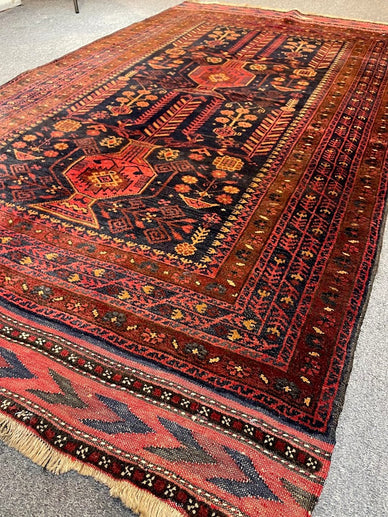 A finely woven semi-antique Baluch rug from Afghanistan, handwoven with 100% organic vegetable-dyed wool. This is a pile-knotted rug. Measurements do not include the fringe length. This piece would be great in any living space.