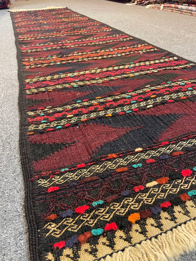 A finely woven semi-antique geometric embroidered cicim rug from Afghanistan, handwoven with 100% organic vegetable-dyed wool. This is a flat-woven cicim, a kilim rug that has minor details hand-embroidered over it (double-woven). Measurements do not include the fringe length. This piece would be great in any living space.