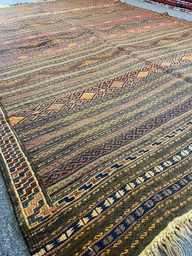 A finely woven semi-antique geometric embroidered cicim rug from Afghanistan, handwoven with 100% organic vegetable-dyed wool. This is a flat-woven cicim, a kilim rug that has minor details hand-embroidered over it (double-woven). Measurements do not include the fringe length. This piece would be great in any living space.