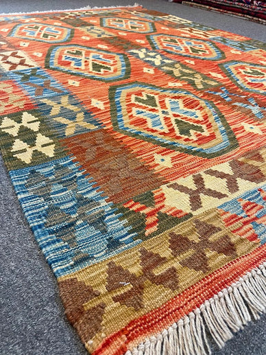 A finely woven Maimana kilim rug from Afghanistan, all handwoven with 100% organic vegetable-dyed wool. This is a flat-woven rug with no pile. Measurements do not include the fringe length. This piece would be great in any living space.