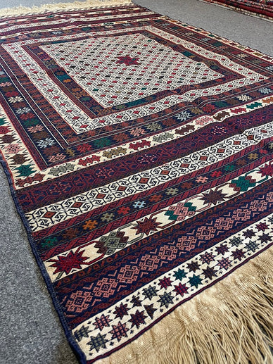 A very finely woven semi-antique Maliki Sumak flatwoven rug from Afghanistan, all handwoven with 100% organic vegetable-dyed wool. This is a flat-woven sumak, a double-stitched, hand-embroidered rug (triple-woven). Measurements do not include the fringe length. This piece would be great in any living space.