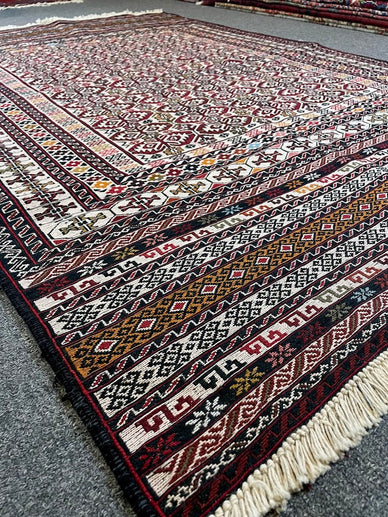 A very finely woven semi-antique Maliki Sumak flatwoven rug from Afghanistan, all handwoven with 100% organic vegetable-dyed wool. This is a flat-woven sumak, a double-stitched, hand-embroidered rug (triple-woven). Measurements do not include the fringe length. This piece would be great in any living space.