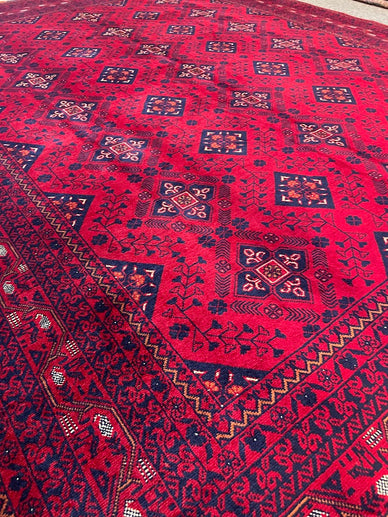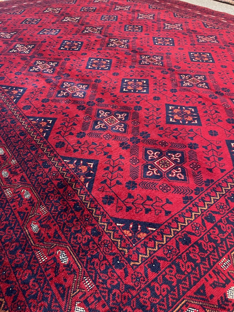 A very finely woven Turkmen rug from Afghanistan, handwoven with 100% organic vegetable-dyed Belgian wool at our looms in Afghanistan, working with Turkmen refugees. Belgian wool is the finest quality, silk-like wool that gives the rug its shine and a softer, smoother feel. This is a pile-knotted rug. Measurements do not include the fringe length. This piece would be great in any living space.