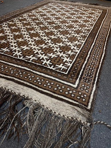 A finely woven geometric Uzbek rug from Afghanistan, handwoven with 100% organic wool. There are no dyes in this rug; all of the colors are the natural colors of the wool. This is a pile-knotted rug. Measurements do not include the fringe length. This piece would be great in any living space.