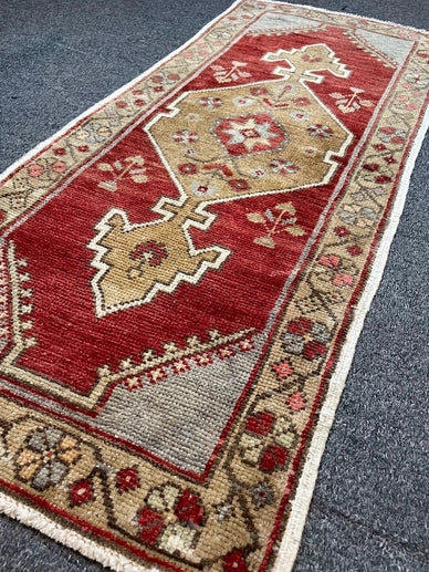 A vintage Anatolian mini rug from Turkey, all handwoven with 100% organic vegetable-dyed wool. This is a pile-knotted rug. Measurements do not include the fringe length. This piece would be great in any living space.