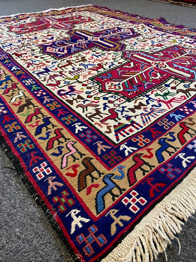 A vintage animal sumak flatwoven rug from Iran, all handwoven with 100% organic vegetable-dyed wool. This is a flat-woven sumak, a double-stitched, hand-embroidered rug (triple-woven). Measurements do not include the fringe length. This piece would be great in any living space.