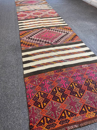 A vintage geometric Balikesir kilim/cicim combo runner rug from Turkey, all handwoven with 100% organic vegetable-dyed wool. This is a flat-woven rug with no pile, with some areas embroidered over (cicim). Measurements do not include the fringe length. This piece would be great in any living space.