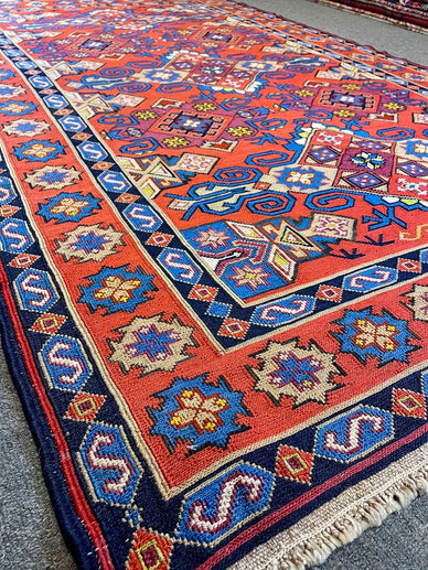 Caucasian Sumaks are double-stitched, hand-embroidered flat-woven rugs known for their unique vegetable dyes and bold geometric patterns. They are some of the most labor-intensive rugs and are made of wool. The sumaks in our curated collection are all antique or semi-antique pieces in incredible condition. Most are narrow area rugs, perfect for historic homes such as DC row homes or New York brownstones.