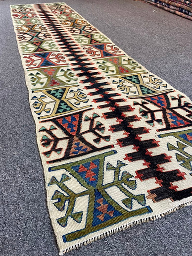 A vintage geometric kilim rug from Turkey, all handwoven with 100% organic vegetable-dyed wool. This is a flat-woven rug with no pile. Measurements do not include the fringe length. This piece would be great in any living space.