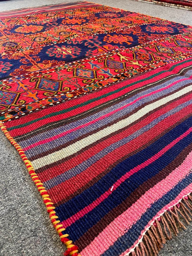 A very finely woven semi-antique Lori Baktiyari combination weave rug (kilim, sumak) from Iran, all handwoven with 100% organic vegetable-dyed wool. This is a unique rug that features two of the four major weaving types. Measurements do not include the fringe length. This piece would be great in any living space.