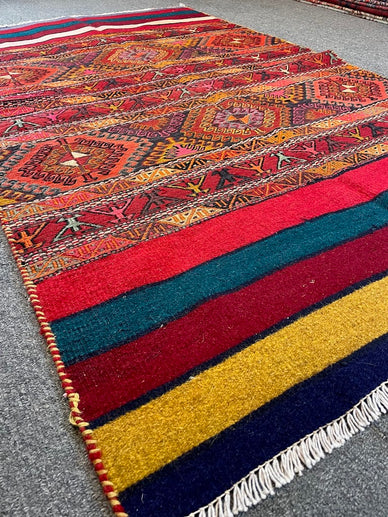 This rug is made from organic wool and vegetable dyes. It is hand-washable: Please use cold water, soft liquid soap, and a soft brush to clean it. Professional cleaning done the traditional way is recommended. Vacuum as usual, but please be mindful of the fringe.