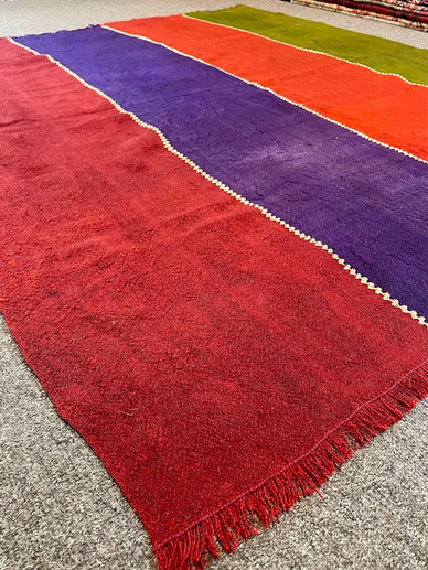 This rug is made from organic wool and vegetable dyes. It is hand-washable: Please use cold water, soft liquid soap, and a soft brush to clean it. Professional cleaning done the traditional way is recommended. Vacuum as usual, but please be mindful of the fringe.