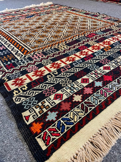A vintage Maliki Sumak flatwoven rug from Afghanistan, all handwoven with 100% organic vegetable-dyed wool. This is a flat-woven sumak, a double-stitched, hand-embroidered rug (triple-woven). Measurements do not include the fringe length. This piece would be great in any living space.