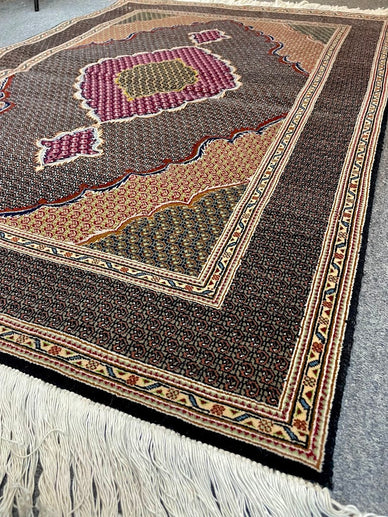 A very finely woven Persian Tabriz, all handwoven with 100% organic vegetable-dyed wool. This is a pile-knotted rug. Measurements do not include the fringe length. This piece would be great in any living space.