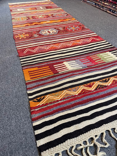 A finely woven vintage geometric embroidered cicim rug from Turkey, all handwoven with 100% organic vegetable-dyed wool. This is a flat-woven cicim, a kilim rug that has minor details hand-embroidered over it (double-woven). Measurements do not include the fringe length. This piece would be great in any living space.