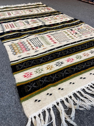 A vintage geometric embroidered cicim rug from Turkey, all handwoven with 100% organic vegetable-dyed wool. This is a flat-woven cicim, a kilim rug that has minor details hand-embroidered over it (double-woven). Measurements do not include the fringe length. This piece would be great in any living space.