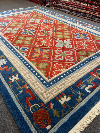 A Tibetan rug with an arrow design, all handwoven with 100% organic vegetable-dyed wool at our looms in Nepal, where we work directly with Tibetan refugees to continue the dying art of weaving. This is a 60-knot quality pile-knotted rug made with hand-spun, hand-carded, hand-combed wool. Measurements do not include the fringe length. This piece would be great in any living space.