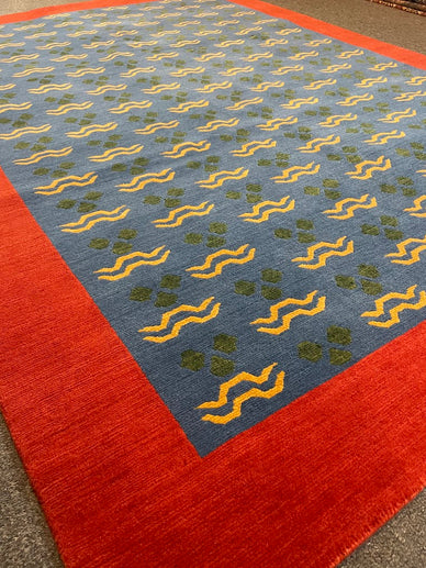 A Tibetan rug with a Chintemani design, all handwoven with 100% organic vegetable-dyed wool at our looms in Nepal, where we work directly with Tibetan refugees to continue the dying art of weaving. This is a 100-knot quality pile-knotted rug made with hand-spun, hand-carded, hand-combed wool. Measurements do not include the fringe length. This piece would be great in any living space.