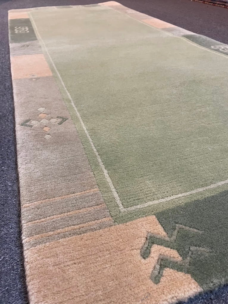 A Tibetan rug with a contemporary design, all handwoven with 100% organic vegetable-dyed wool at our looms in Nepal, where we work directly with Tibetan refugees to continue the dying art of weaving. This is a 100-knot quality pile-knotted rug made with hand-spun, hand-carded, hand-combed wool. Measurements do not include the fringe length. This piece would be great in any living space.