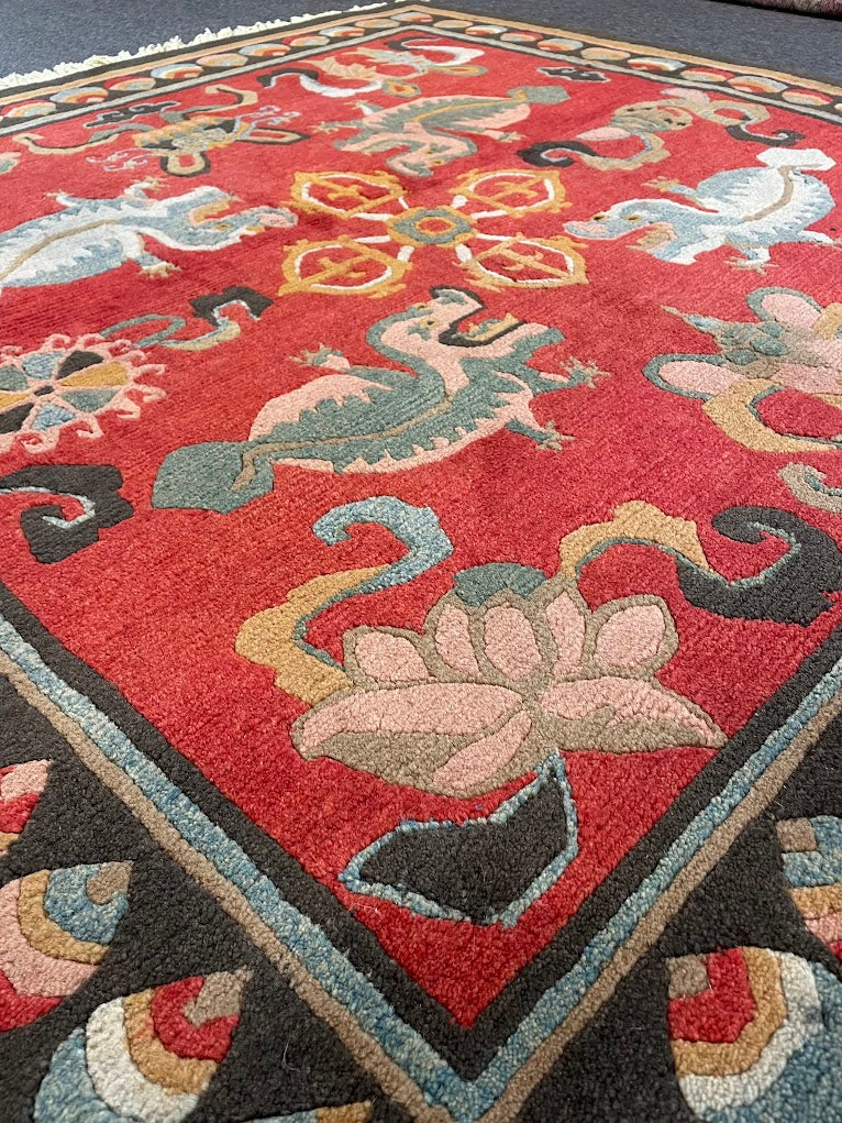 A Tibetan rug with a dancing dragon design, all handwoven with 100% organic vegetable-dyed wool at our looms in Nepal, where we work directly with Tibetan refugees to continue the dying art of weaving. This is a 60-knot quality pile-knotted rug made with hand-spun, hand-carded, hand-combed wool. Measurements do not include the fringe length. This piece would be great in any living space.