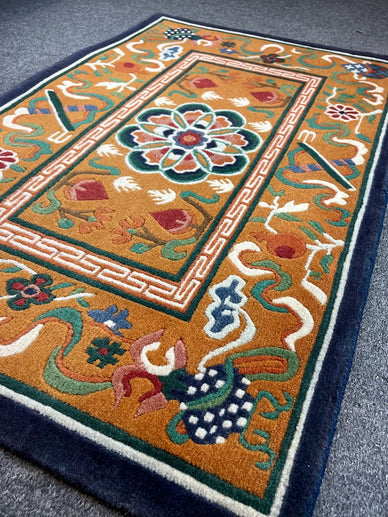 A Tibetan rug with a double dorjee design, all handwoven with 100% organic vegetable-dyed wool at our looms in Nepal, where we work directly with Tibetan refugees to continue the dying art of weaving. This is a 100-knot quality pile-knotted rug made with hand-spun, hand-carded, hand-combed wool. Measurements do not include the fringe length. This piece would be great in any living space.