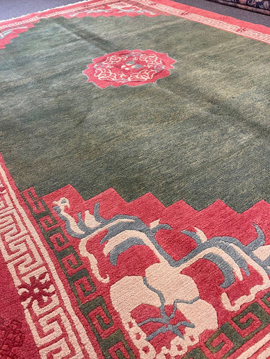 A Tibetan rug with a Double Dorjee design, all handwoven with 100% organic vegetable-dyed wool at our looms in Nepal, where we work directly with Tibetan refugees to continue the dying art of weaving. This is a 60-knot quality pile-knotted rug made with hand-spun, hand-carded, hand-combed wool. Measurements do not include the fringe length. This piece would be great in any living space.