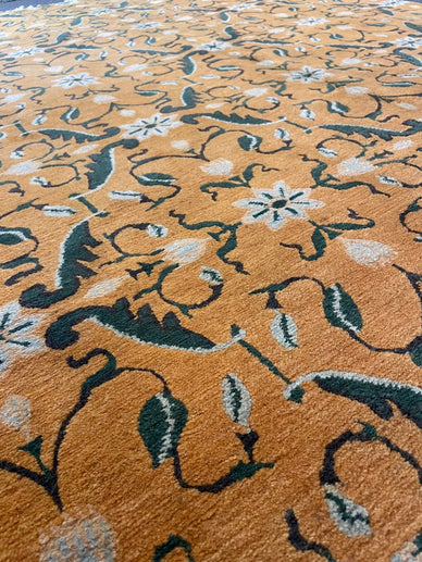 A Tibetan rug with a floral design, all handwoven with 100% organic vegetable-dyed wool at our looms in Nepal, where we work directly with Tibetan refugees to continue the dying art of weaving. This is a 100-knot quality pile-knotted rug made with hand-spun, hand-carded, hand-combed wool. Measurements do not include the fringe length. This piece would be great in any living space.