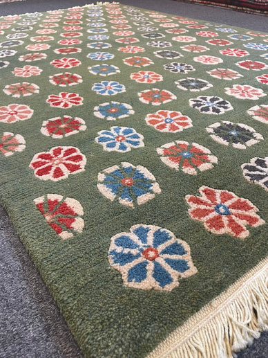 A Tibetan rug with a floral Patan Metole design, all handwoven with 100% organic vegetable-dyed wool at our looms in Nepal, where we work directly with Tibetan refugees to continue the dying art of weaving. This is a 60-knot quality pile-knotted rug made with hand-spun, hand-carded, hand-combed wool. Measurements do not include the fringe length. This piece would be great in any living space.