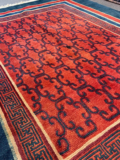 A Tibetan rug with a Khotanese design, all handwoven with 100% organic vegetable-dyed wool at our looms in Nepal, where we work directly with Tibetan refugees to continue the dying art of weaving. This is a 60-knot quality pile-knotted rug made with hand-spun, hand-carded, hand-combed wool. Measurements do not include the fringe length. This piece would be great in any living space.