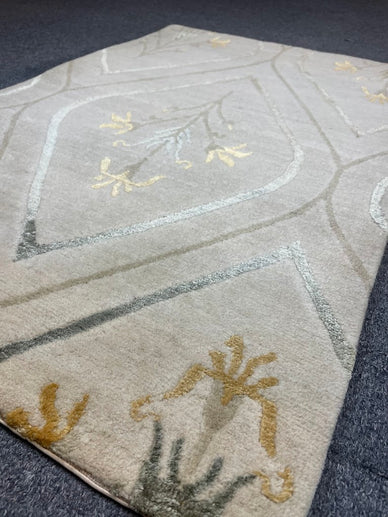 A Tibetan rug with a contemporary floral design, all handwoven with 100% organic vegetable-dyed wool and silk at our looms in Nepal, where we work directly with Tibetan refugees to continue the dying art of weaving. This is a 100-knot quality pile-knotted rug made with hand-spun, hand-carded, hand-combed wool and silk. Measurements do not include the fringe length. This piece would be great in any living space.