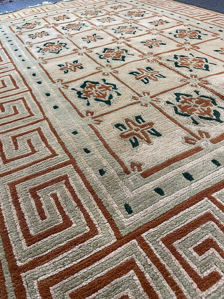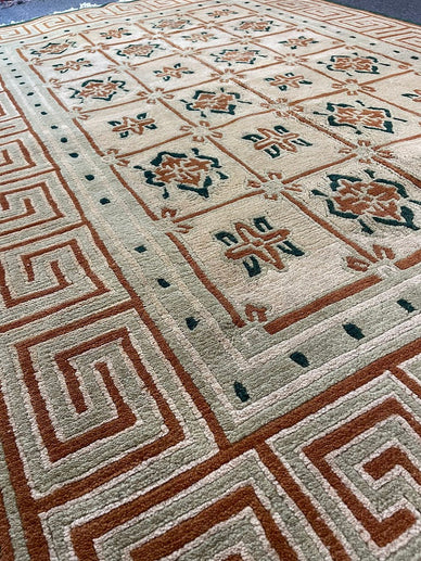 A Tibetan rug with a Mongolian Shield design, all handwoven with 100% organic vegetable-dyed wool at our looms in Nepal, where we work directly with Tibetan refugees to continue the dying art of weaving. This is a 60-knot quality pile-knotted rug made with hand-spun, hand-carded, hand-combed wool. Measurements do not include the fringe length. This piece would be great in any living space.