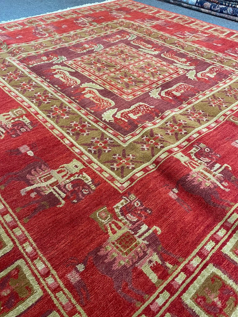 A very finely woven Tibetan rug with a Pazyryk rug, handwoven with 100% organic vegetable-dyed wool at our looms in Nepal, where we work with Tibetan refugees to continue the dying art of traditional weaving. This is a 100-knot quality Tibetan rug. The design comes from the oldest known carpet in history, carbon-dated to the 4th century BC, which is still intact at the Hermitage Museum in St. Petersburg. Petersburg, Russia. This is a pile-knotted rug. Measurements do not include the fringe length. This piece would be great in any living space.