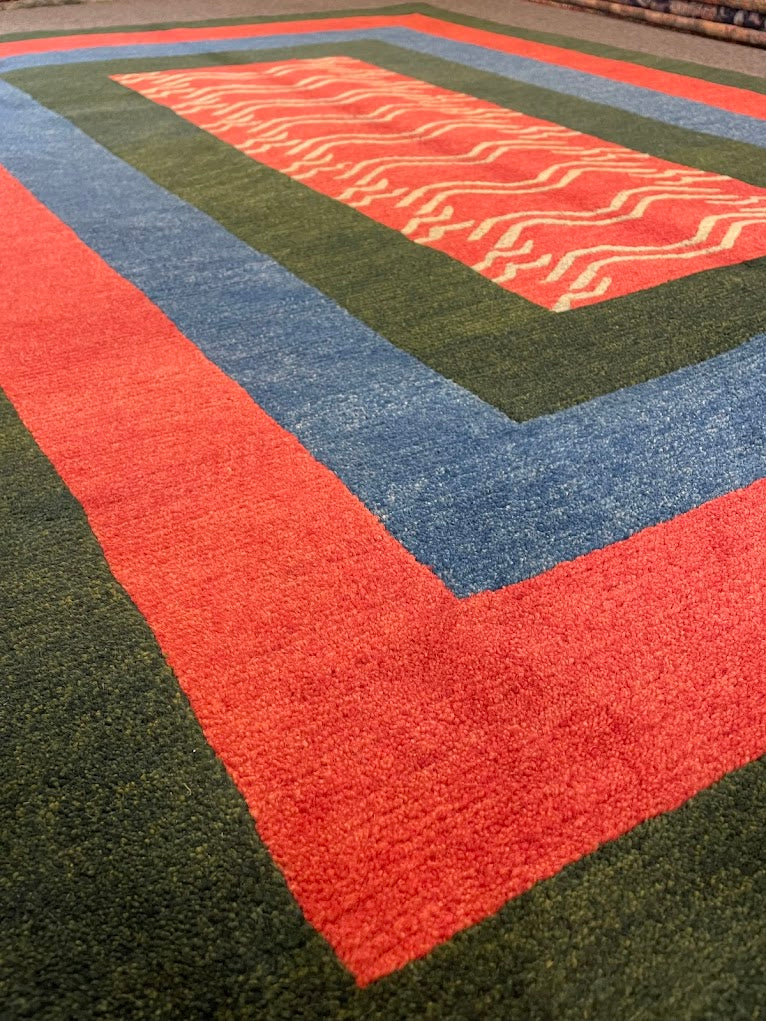 A Tibetan rug with a tiger stripe design, all handwoven with 100% organic vegetable-dyed wool at our looms in Nepal, where we work directly with Tibetan refugees to continue the dying art of weaving. This is a 60-knot quality pile-knotted rug made with hand-spun, hand-carded, hand-combed wool. Measurements do not include the fringe length. This piece would be great in any living space.