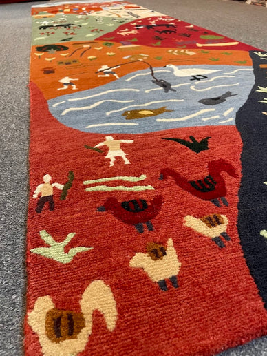 A Tibetan rug with a village design, all handwoven with 100% organic vegetable-dyed wool at our looms in Nepal, where we work directly with Tibetan refugees to continue the dying art of weaving. This is a 100-knot quality pile-knotted rug made with hand-spun, hand-carded, hand-combed wool. Measurements do not include the fringe length. This piece would be great in any living space.