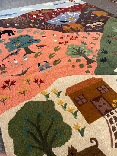 A Tibetan rug with a village design, all handwoven with 100% organic vegetable-dyed wool at our looms in Nepal, where we work directly with Tibetan refugees to continue the dying art of weaving. This is a 100-knot quality pile-knotted rug made with hand-spun, hand-carded, hand-combed wool. Measurements do not include the fringe length. This piece would be great in any living space.