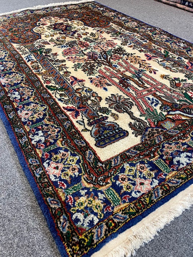 A finely woven vintage tree of life design rug from Egypt, all handwoven with 100% organic vegetable-dyed wool. This is a pile-knotted rug. Measurements do not include the fringe length. This piece would be great in any living space.
