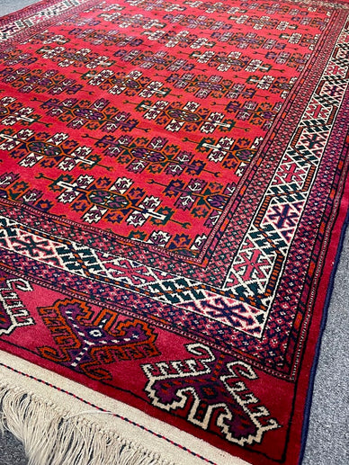 A very finely woven semi-antique Turkmen Yamut rug from Turkmenistan, handwoven with 100% organic vegetable-dyed wool. This is a pile-knotted rug. Measurements do not include the fringe length. This piece would be great in any living space.