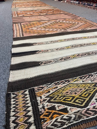 A finely woven semi-antique geometric Balikesir cicim from Turkey, This is a flat-woven rug with no pile. Measurements do not include the fringe length. This piece would be great in any living space.