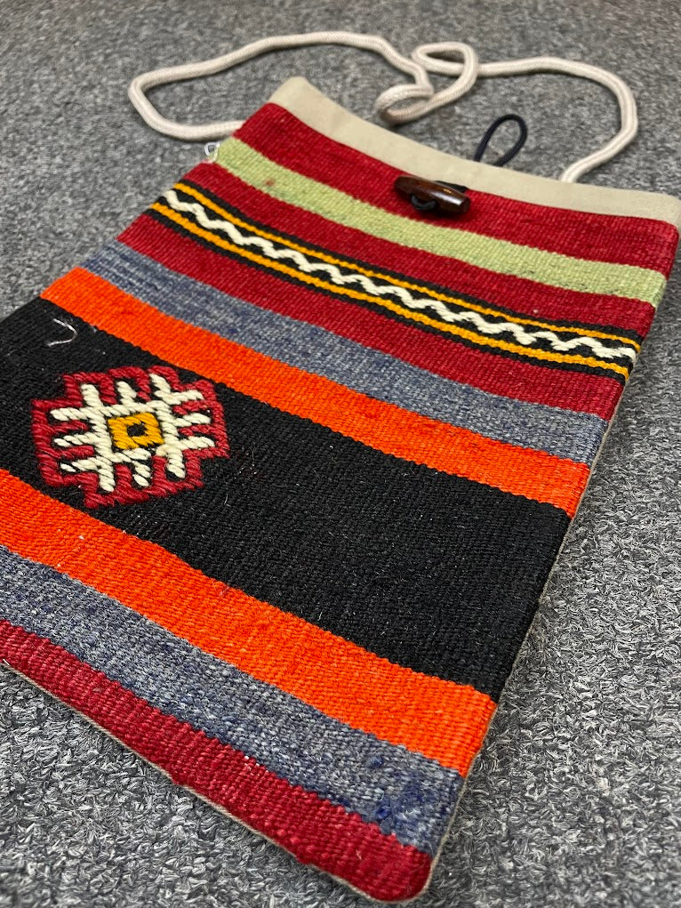 A handmade rug purse, assembled in Turkey from a semi-antique Turkish cicim embroidered rug. The rug is handwoven from vegetable-dyed wool, and the backing is 100% cotton.