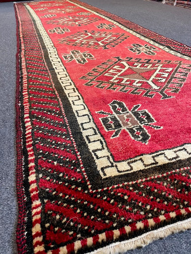A finely woven semi-antique geometric rug from Turkey, handwoven with 100% organic vegetable-dyed wool. This is a pile-knotted rug. Measurements do not include the fringe length. This piece would be great in any living space.