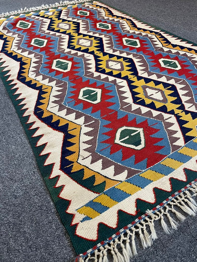 A vintage geometric Van kilim rug from Turkey, all handwoven with 100% organic vegetable-dyed wool. This is a flat-woven rug with no pile. Measurements do not include the fringe length. This piece would be great in any living space.