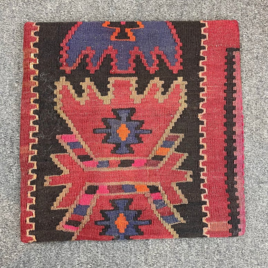 A handmade kilim pillowcase, assembled in Turkey from a semi-antique Turkish kilim rug. The rug is handwoven from vegetable-dyed wool, and the backing is 100% cotton.