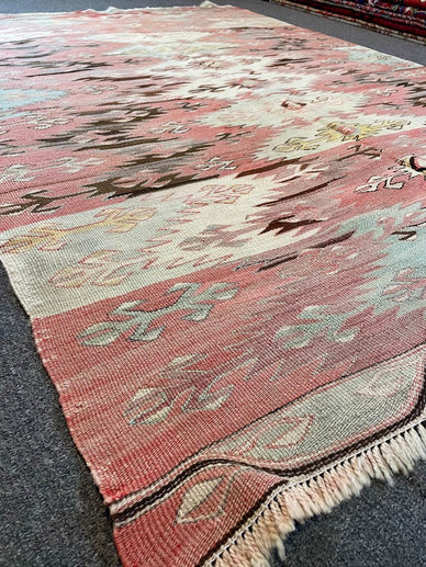 A very finely woven semi-antique Konya kilim from Turkey, handwoven with 100% organic vegetable-dyed wool. This is a flat-woven rug with no pile. Measurements do not include the fringe length. This piece would be great in any living space.