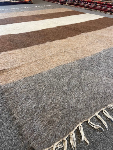 A finely woven vintage Siirt kilim/blanket rug from Turkey, all handwoven with 100% organic Mohair. This is a flat-woven rug with no pile, but has two sides, one being soft and fluffy due to the materials. Measurements do not include the fringe length. This piece would be great in any living space.