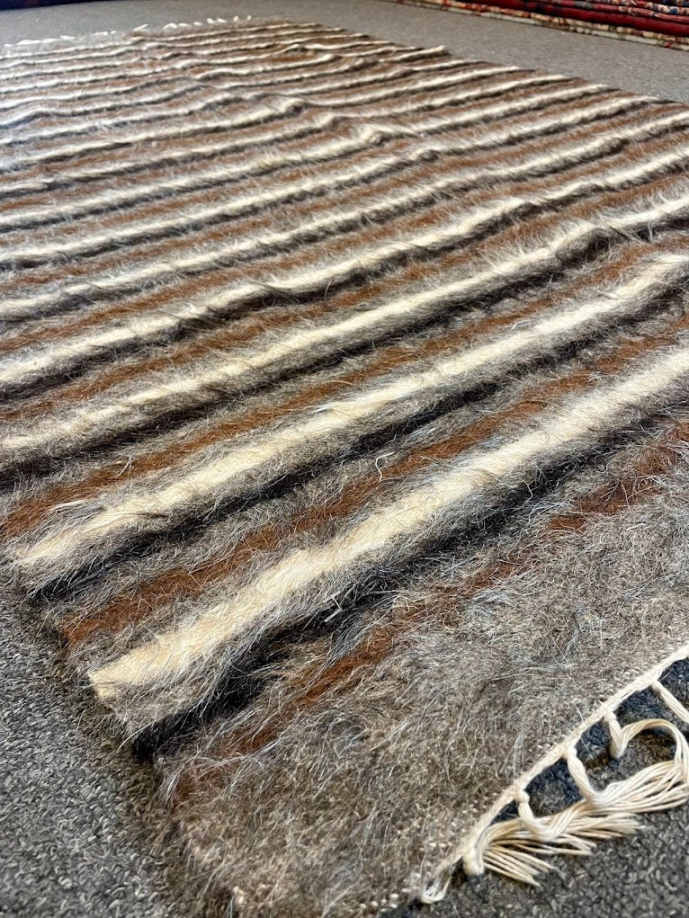 A finely woven vintage Siirt kilim/blanket rug from Turkey, all handwoven with 100% organic Mohair. This is a flat-woven rug with no pile, but has two sides, one being soft and fluffy due to the materials. Measurements do not include the fringe length. This piece would be great in any living space.