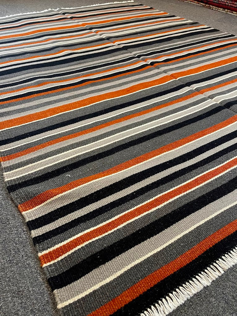A finely woven semi-antique striped kilim flatwoven rug from Turkey, handwoven with 100% organic vegetable-dyed wool. This is a flat-woven rug with no pile. Measurements do not include the fringe length. This piece would be great in any living space.