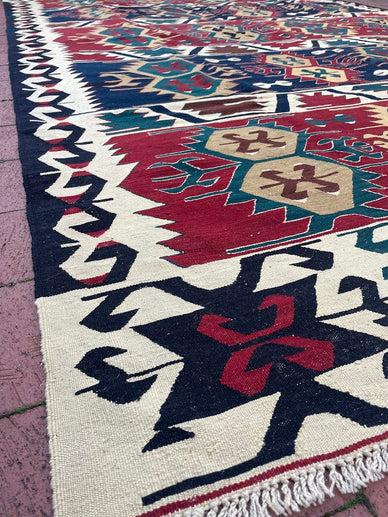 A very finely woven Usak kilim from Turkey, handwoven with 100% organic vegetable-dyed wool. This is a flat-woven rug with no pile. Measurements do not include the fringe length. This piece would be great in any living space.