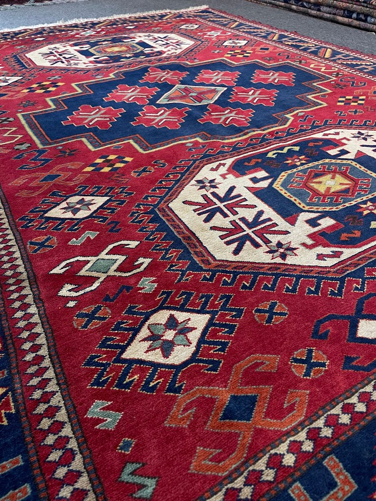 A very finely woven semi-antique Caucasian rug from our looms in Pakistan by Turkmen refugees, where we work to continue the dying art of traditional weaving. Handwoven with 100% organic vegetable-dyed wool. This is a pile-knotted rug. Measurements do not include the fringe length. This piece would be great in any living space.