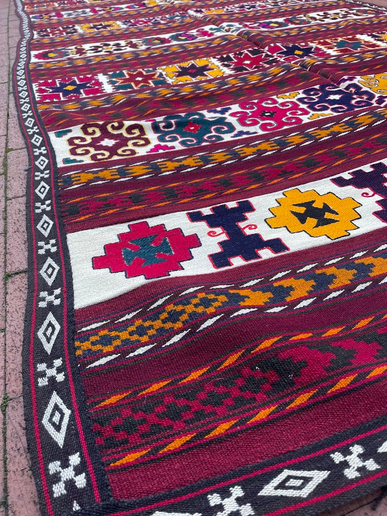 A finely woven semi-antique striped geometric embroidered cicim rug from Uzbekistan, handwoven with 100% organic vegetable-dyed wool. This is a flat-woven cicim, a kilim rug that has minor details hand-embroidered over it (double-woven). Measurements do not include the fringe length. This piece would be great in any living space.