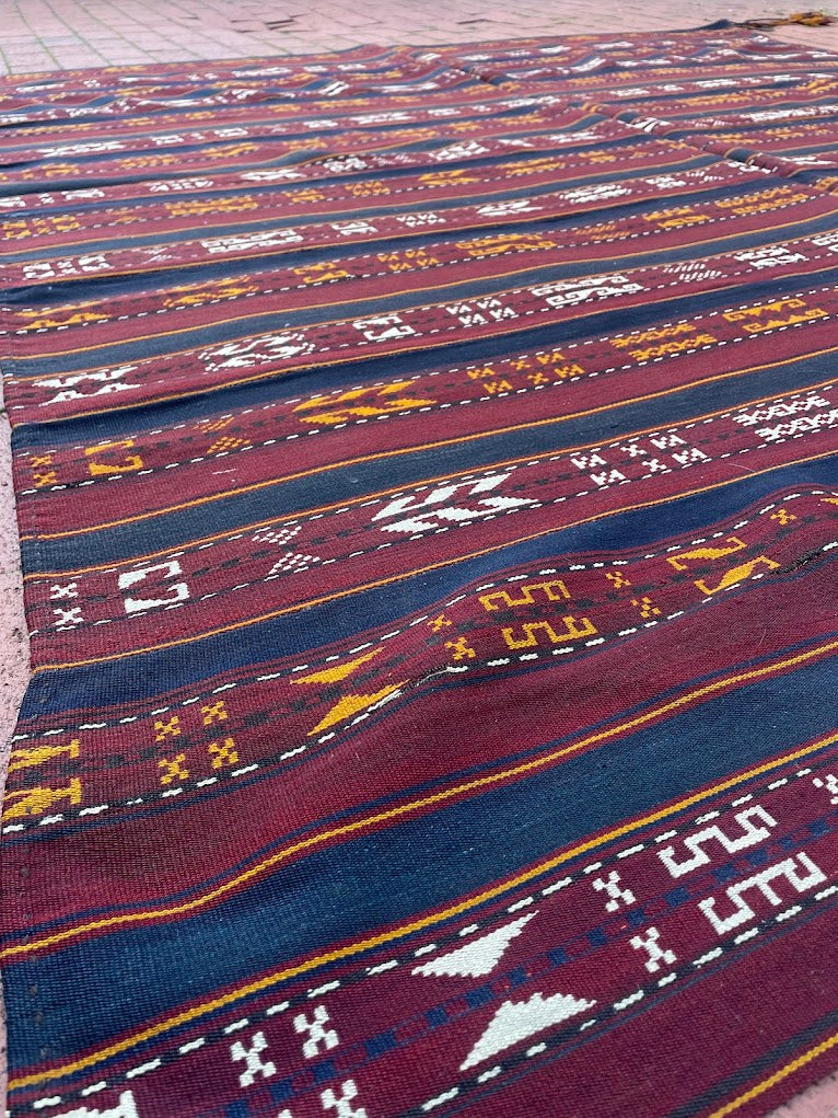 This rug is made from organic wool and vegetable dyes. It is hand-washable: Please use cold water, soft liquid soap, and a soft brush to clean it. Professional cleaning done the traditional way is recommended. Vacuum as usual, but please be mindful of the fringe.